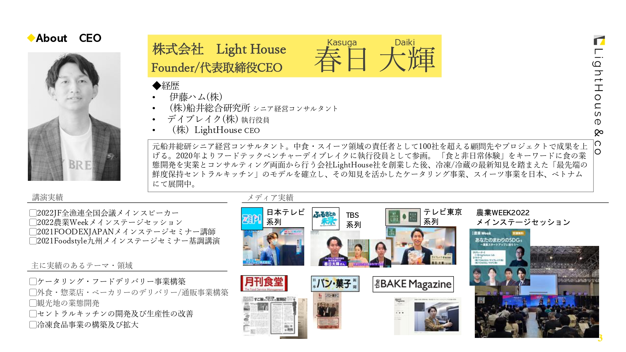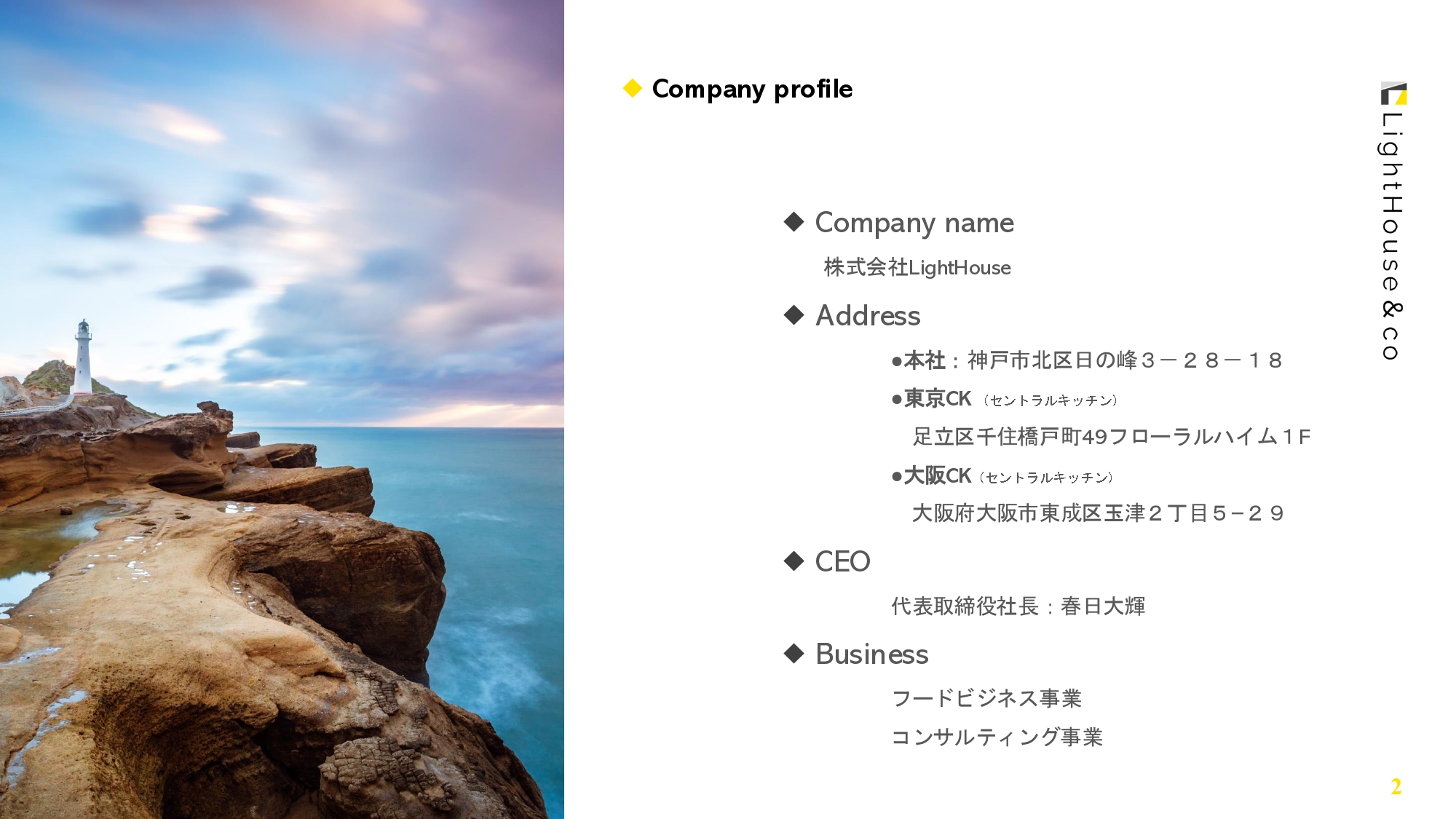 | オフィス | ・本社: 神戸市北区日の峰3−28−18 ・東京セントラルキッチン: 足立区千住橋戸町49-1F ・大阪セントラルキッチン: 大阪市東成区玉津2丁目5−29 |