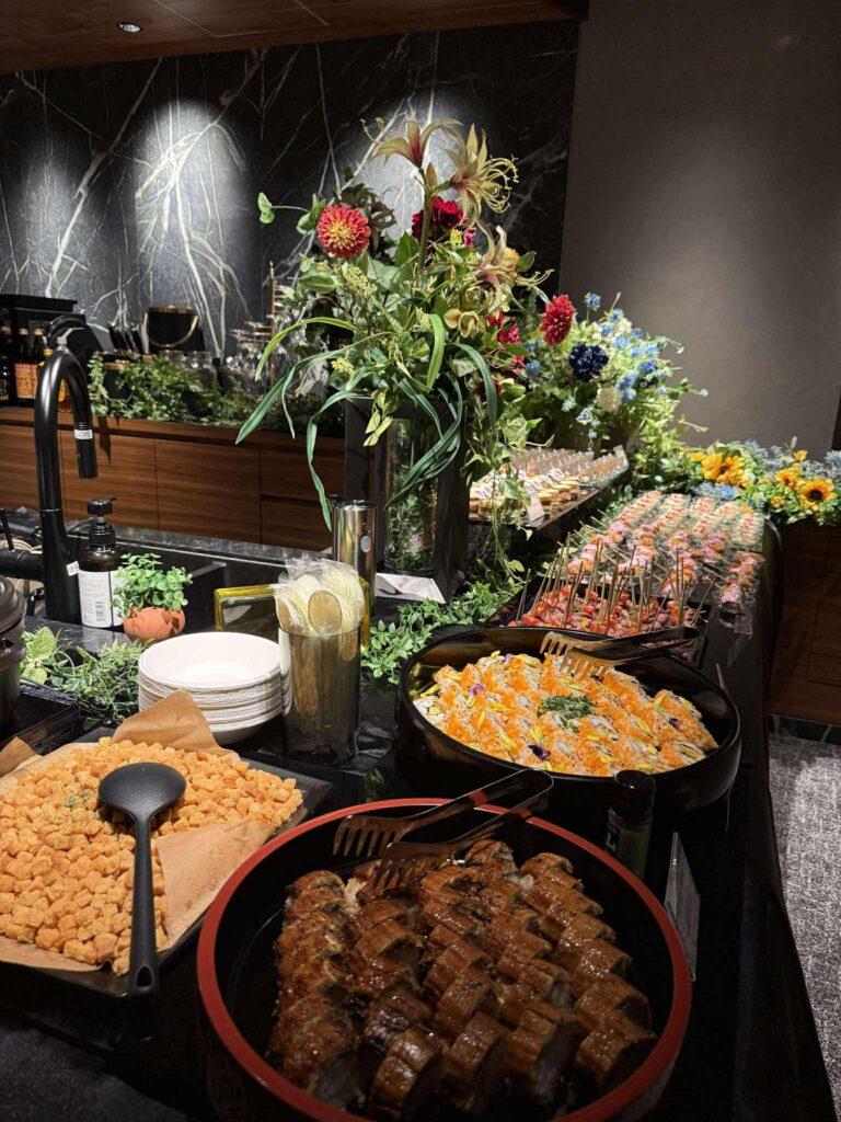 ゲストの目の前で寿司を握ったり、ローストビーフをカットしたりするライブ演出は、食事を“体験”へと昇華させます。特別感が高まり、同窓会の会話も自然と盛り上がります。