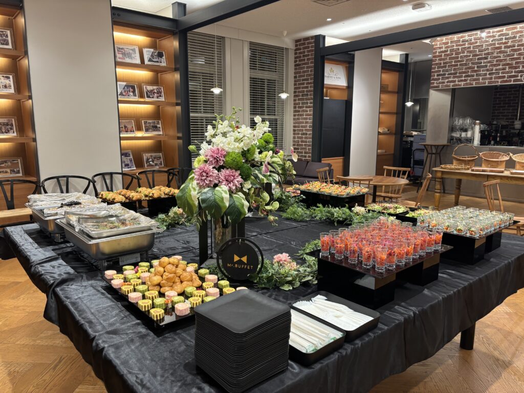 Mr.BUFFETは、東京・関西・海外(ホーチミン)で展開するハイクオリティなケータリングブランド。東京拠点は足立区にセントラルキッチンを構え、八重洲ミッドタウンをはじめ都内各地へスピーディーに配達可能です。最大の魅力は、リピート率90%超という圧倒的な顧客満足度。シェフ陣はフランス料理やイタリア料理で修行を積んだプロフェッショナルで、旬の食材を活かした彩り豊かな料理を提供します。フィンガーフードから本格ビュッフェ、ライブ演出(出張寿司職人・ローストビーフカッティング)まで幅広く対応し、企業イベントやレセプション、ウェディング二次会など多様なシーンで利用可能。準備から撤収までワンストップで行い、幹事の負担を大幅に軽減します。