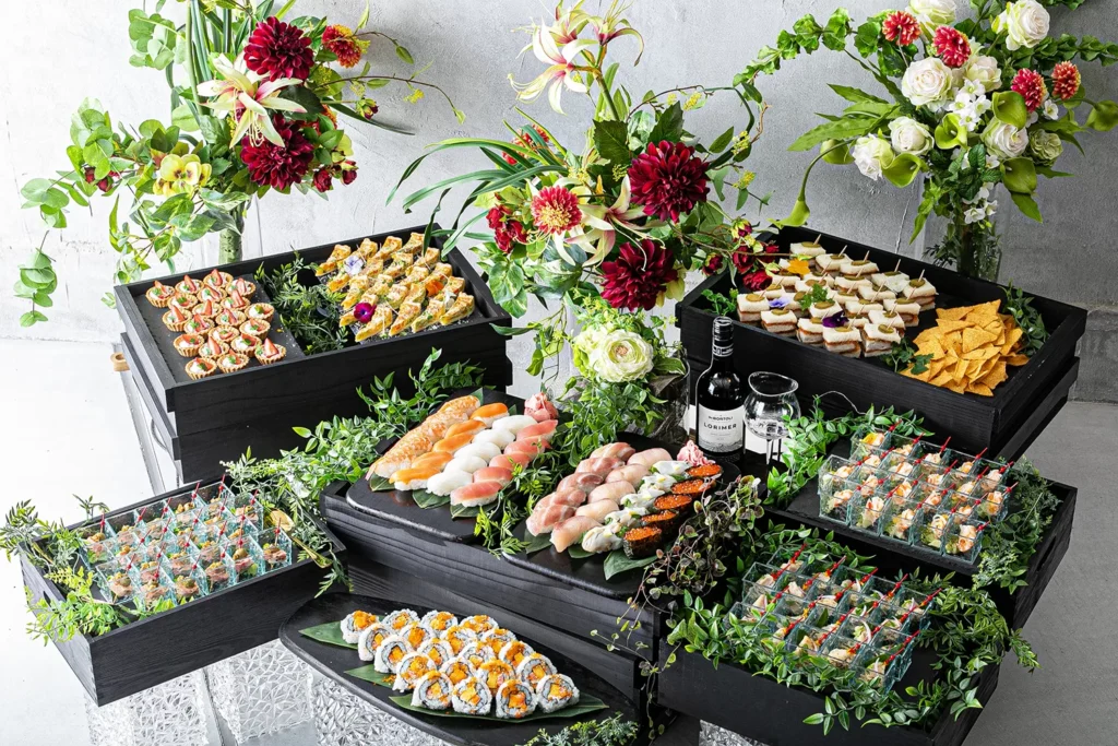 Mr.BUFFET東京では、ビールに合うフィンガーフードや寿司、肉料理など、フードとの相性まで考えたトータル提案が可能です。乾杯だけで終わらない、料理も演出も調和したプランで、会場全体の満足度を高めます。