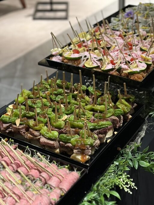 イスラエル企業主催の40名規模パーティーでは、ユダヤ教の食規定「コーシャ」に対応しました。Mr.BUFFETは事前ヒアリングを徹底し、専用器材や包装で安全に提供。肉と乳製品を分けるなど宗教的ルールを守り、ベジタリアンやグルテンフリーも用意し多国籍ゲストに配慮しました。料理は、和牛ステーキと焼き野菜のピンチョス、ローストビーフのピンチョス、鮮やか和風タルタルの唐揚げなど、一口サイズで高級感のあるメニューが好評でした。
