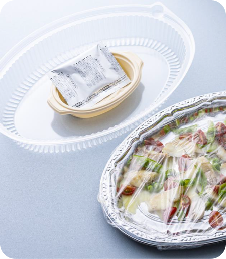 使い捨ての容器に盛り付けられたオードブルをデリバリー。温まる包材に入ったアツアツオードブルも大人気のお気軽なサービスです。