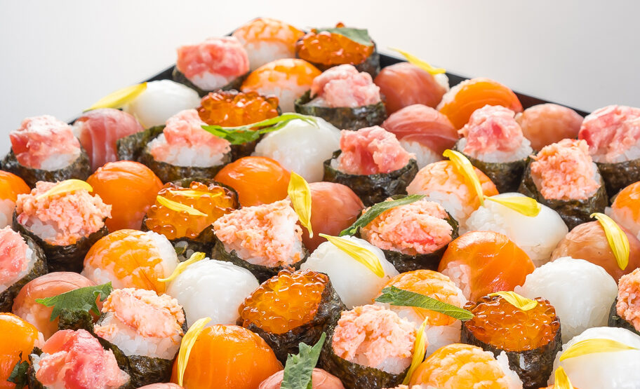 まぐろやサーモン、えびなど新鮮な海の幸を丁寧に仕込み、宝石箱のように盛り付けた海鮮手毬寿司。