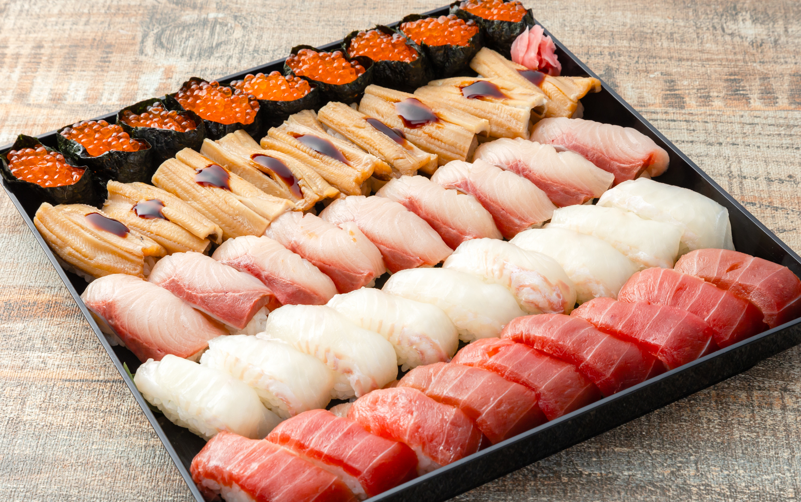 江戸前寿司粋一貫監修のマグロ、イカ、サーモンなど大定番の本格握り寿司。